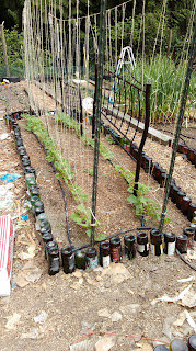 Here are 2 pics of aisles...without grass. One has the mulch on it and other just cardboard and shredded paper. You'll also notice in the pictures the other thing I have been doing with the beds...bordering them. You can see in the picture above that they didn't have borders either, which is probably the main reason the grass was such a hard battle. My goal is to border them completely with wine bottles. It is a fantastic way to recycle those wine bottles! I get plenty from church.